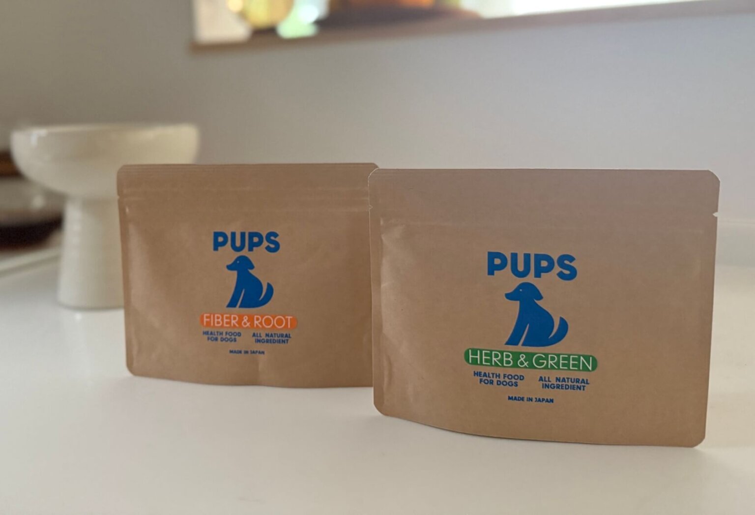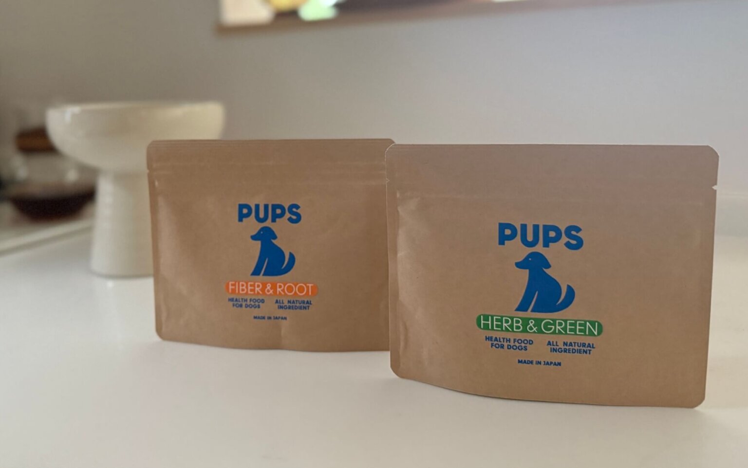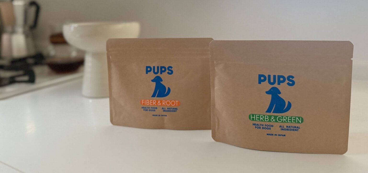 PUPS(パプス)の由来、Pupsは本来「子犬」の意味ですが、いくつになっても可愛らしいという意味合いで使う呼び方である事と、「パプス」という音の響きが元気でいつもハッピーな犬らしさを感じられるポップな雰囲気と思い名付けました。子犬用ではなく全年齢の犬の為のブランドです。
